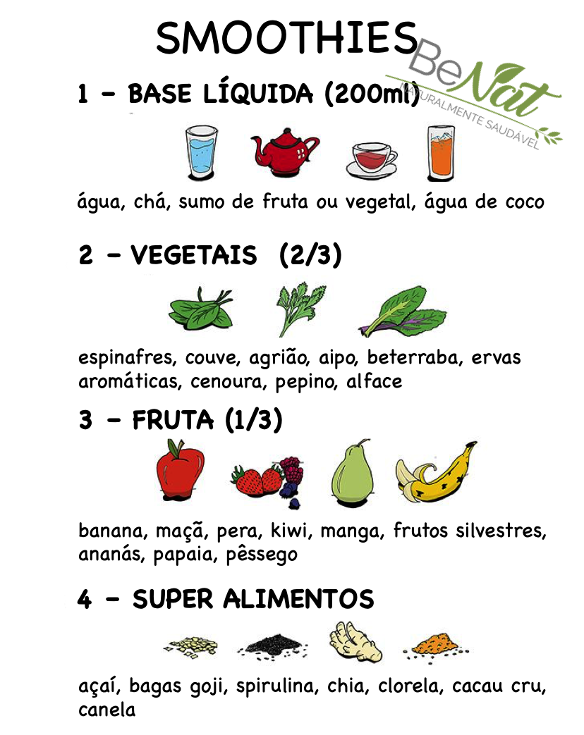 Uma das grandes vantagens dos smoothies, é que se podem fazer infinitas variações saudáveis, de acordo com o nosso gosto pessoal, com as frutas e vegetais que temos disponíveis ou mesmo com as necessidades do nosso corpo em determinado momento.